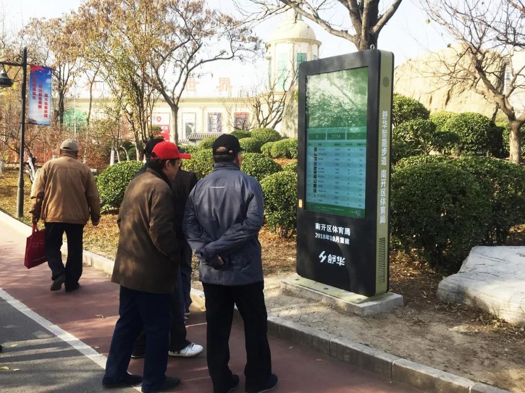 據(jù)進(jìn)一步了解,2018年,天津南開區(qū)健康主題公園內(nèi)設(shè)立了舒華智能健身步道,全長(zhǎng)為1公里,主要由人流量探測(cè)系統(tǒng)、步道定位工作站、健康互動(dòng)大屏、健康心率柱、室外環(huán)境監(jiān)測(cè)器以及來一場(chǎng)“智能步道”系統(tǒng)等組成。途中每隔一段距離都會(huì)配有一個(gè)舒華健康心率柱,人們?cè)谶\(yùn)動(dòng)間歇握住柱子上的心率觸摸鍵時(shí),即可檢查自己的運(yùn)動(dòng)強(qiáng)度與狀態(tài),了解自身健康情況,十分方便、人性化。