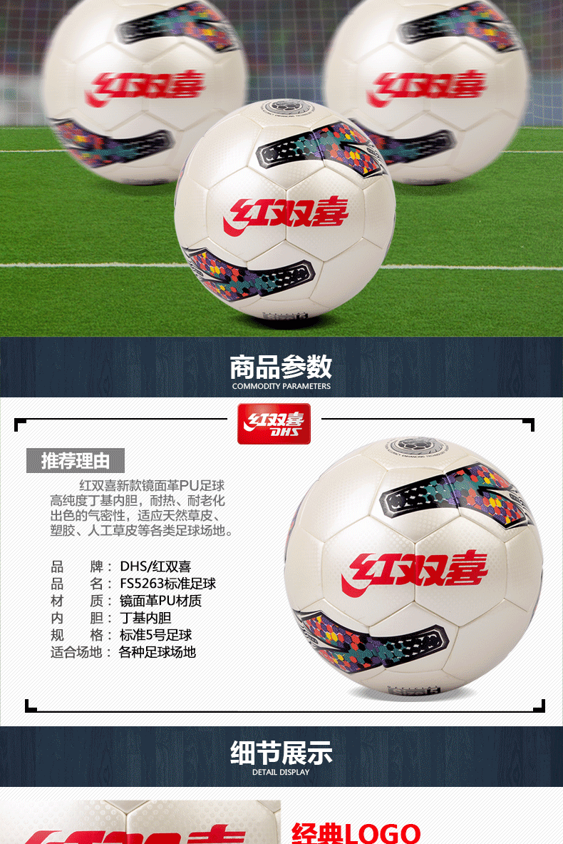 紅雙喜足球FS5263-1 鏡面革PU膠粘足球比賽用球