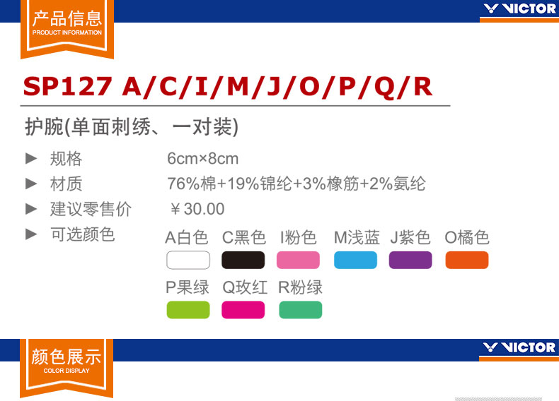 VICTOR威克多羽毛球運動護(hù)腕棉質(zhì)多色運動健身訓(xùn)練 SP127