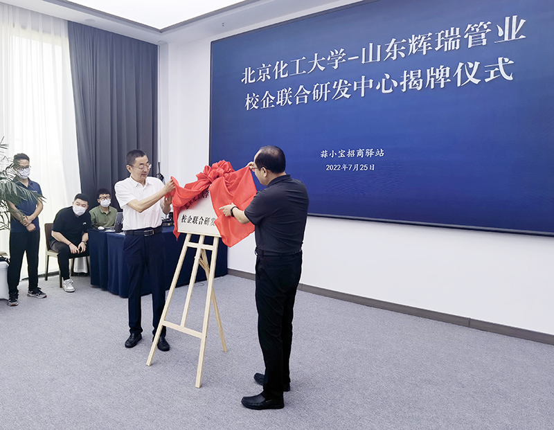 為北京化工大學-山東輝瑞管業(yè)校企聯(lián)合研發(fā)中心揭牌揭牌人:何雨駿、李兆勝